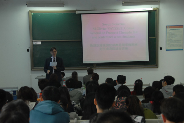 下午,法国驻成都总领事魏雅树先生、法国驻成都总领事馆教育合作专员李凤兰女士、法国高等教育署成都中心负责人罗瑞格先生及成都Campus France驻重庆办事处负责人陈佳女士来访必赢官网,之前,学校孙校长会见了法国客人。总领事魏雅树先生专门为必赢官网中法交流项目及法语专业学生举行了题为“留法前的准备”的讲座,必赢官网院长赵驹及相关人员热情接待了总领事一行。