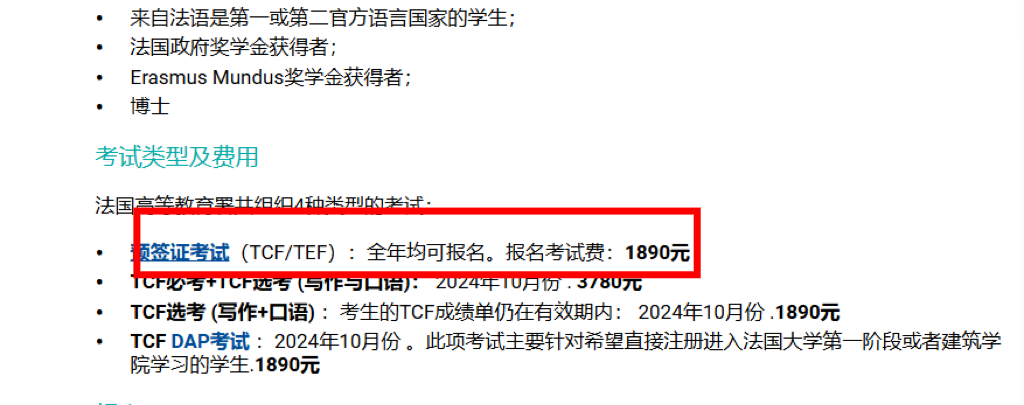 注意:2+2出国班的同学考试类型及费用选第一个《预签证考试(TCF/TEF)》,如图所示