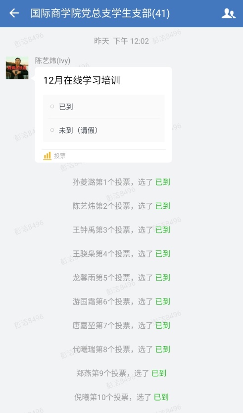 2020年11月19日,中共必赢76net线路唯一官方网站党总支学生一、二支部在企业微信群召开了12月份的支部大会,本次会议由一支部王晓枭同学线上介绍习近平总书记关于立德树人的讲话、在科学家座谈会以及基层座谈会讲话的开展了本月的主题党日活动。学生二支部书记汪洁老师,党支部王娟老师、田莎老师、冯诗淇老师、黎红老师、彭丹老师及一、二支部全体成员参加了本次大会。支部大会应到41人,实到40人。