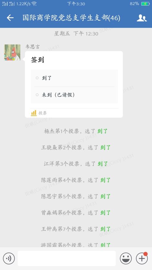 2020年11月27日星期五中午12点30分,必赢76net线路唯一官方网站党总支学生一支部、二支部在企业微信上召开了11月份支部大会,本次会议主要开展了巩固深化“不忘初心,牢记使命”的主题教育活动。学生二支部书记汪洁老师,党支部王娟老师、田莎老师、彭丹老师等老师及学生一支部、二支部全体成员参加了本次大会,支部大会应到46人,实到43人。