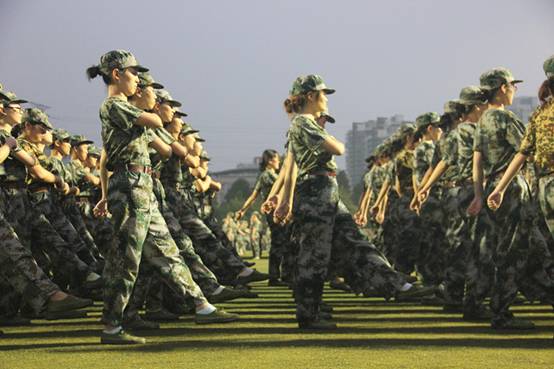 南操场上,教官们身着常服,用洪亮的嗓子发出一声声口令,列成一个个方队的同学们高度集中精神,顶着烈日,随着教官们的口令立正、稍息、向右看齐,统一的绿色迷彩军装散发着蓬勃的朝气,有力的踏步声震动了操场上的砂砾,扬起阵阵烟尘。教官们一遍又一遍地示范标准动作,不厌其烦地纠正同学们常犯的错误,越来越沙哑的嗓音昭示着他们的敬业与尽责,同学们也十分认真地配合教官进行每个队列项目的反复练习。烈日和高温考验着同学们的意志力,不断有体力不支的同学倒下,两侧的同学们会及时地将倒下的伙伴扶到主席台前休息调整,而继续立在阳光下的其他同学并未被倒下的同伴削去半分坚定,不顾流进眼睛的汗水,不顾被晒得刺痛的皮肤,认真完成教官的每个要求。