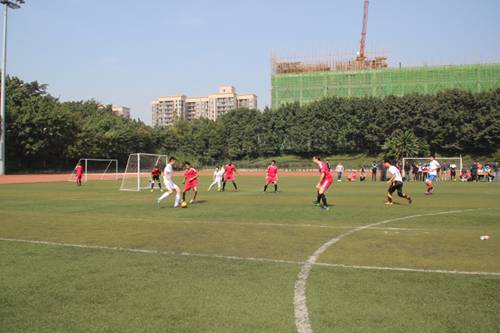 中午12:30,随着裁判的一声哨响,比赛正式开始,开场后双方体力尚且充沛你来我往,互不相让。上半场过半,国商队率先发难,2014级21号球员兰力前场接球后连续晃开两名防守队员,强力进攻,留学生队守门员猝不及防,球应声入网,国商队先拔头筹。随后双方又经历了几个回合的攻防,留学生队加强进攻,在上半场比赛结束之际突进一球拉回比分。下半场开始后,双方开始加强进攻,国商队在一次防守反击中饲得良机,2012级8号球员李攀前场得球后长驱直入杀入禁区,一脚推射将球射入球门,门将鞭长莫及,比分改写为2:1,此时国商同学集体欢呼雀跃。随后留学生队继续发动猛攻,试图挽回局势。可过了几分钟后,依然无法拉回比分。随着双方体力上的消耗之后的比赛节奏进行较慢,裁判员宣布中场休息。最后的角逐开始了,全场气氛变得紧张而又激烈,终于在2012级8号球员李攀禁区内一脚凌空抽射,球应声入网,国商队再次领先,,随着主裁判哨声响起,全场比赛结束。国商队以3:1的成绩赢得了此次比赛。