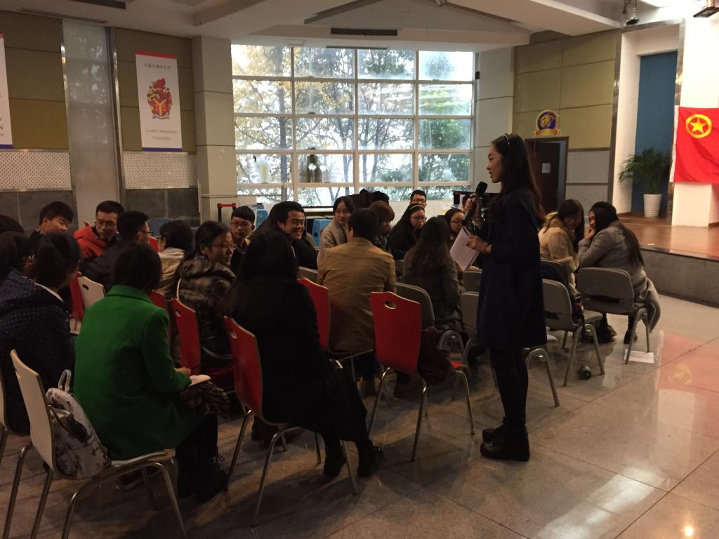两位主持人先后致辞并宣布本次活动拉开帷幕。活动开始,同学们一同观看了小短片,缅怀抗日战争那段悲痛的历史和在战争中壮烈牺牲的烈士们。随后,由14级金融三支部的尚佳静同学的富有现代色彩的爵士舞和吕子尧同学的钢琴独奏“遇见”都渲染了缅怀过去、畅想未来的气氛。为增进同学之间的认识,同学们通过抽签被分成了六个组,开始进行多个小游戏。其中,最有趣的游戏当属“七拼八凑”的计时寻物游戏和“听歌词猜歌曲”的猜曲游戏,每一个同学都参与其中,相互配合,凸显了大家参与的积极性,现场气氛热烈。在一系列激烈地比拼后,第一组和第六组并列第一,分别获得了小奖品。最后在活动结束之际,每位同学在分发的卡片上写下了自己的愿望,并由主持人抽取并与所有人分享。本次活动圆满结束。