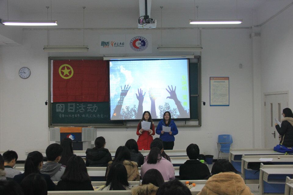 2015年12月14日上午10:40,由必赢官网14级人资支部举办的以“青春灿烂中国梦,唤我民族伟复兴”为主题的班级团日活动于60405教室正式开始。参加活动的不仅有14级人资班全体同学,还包括院分团委学生会的两位组织部成员。