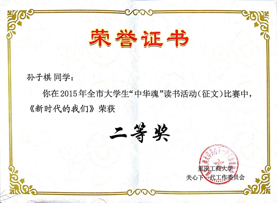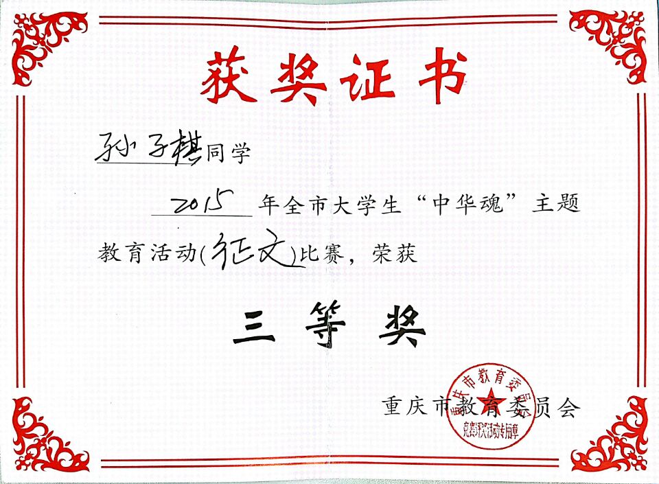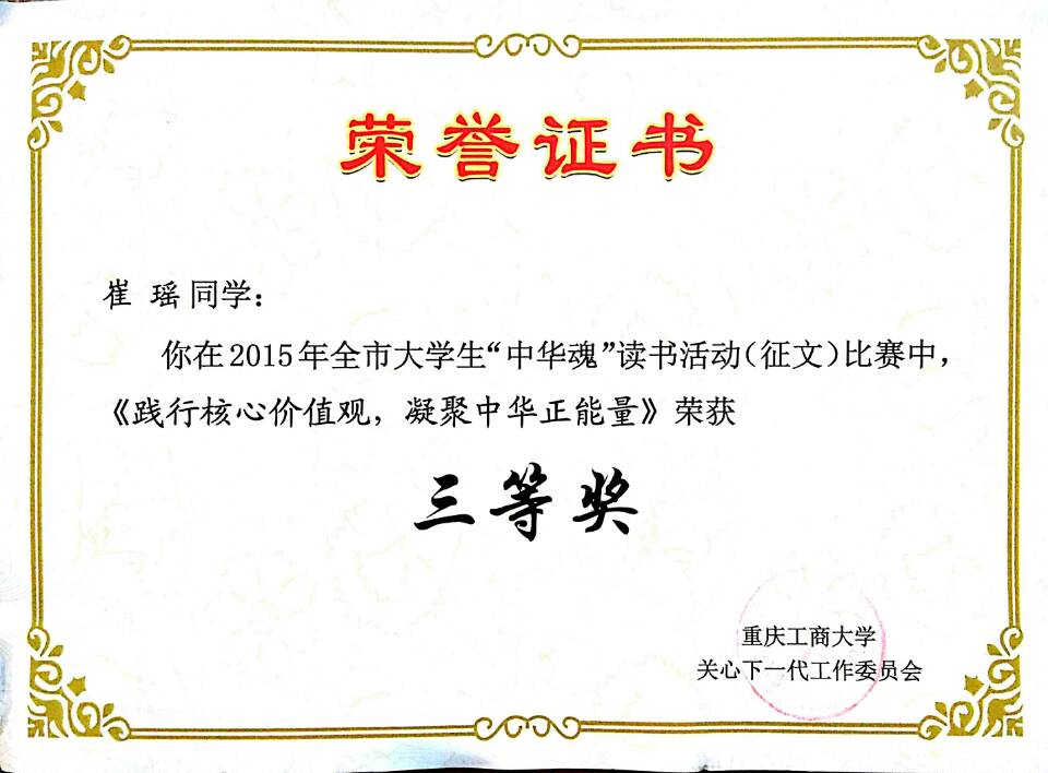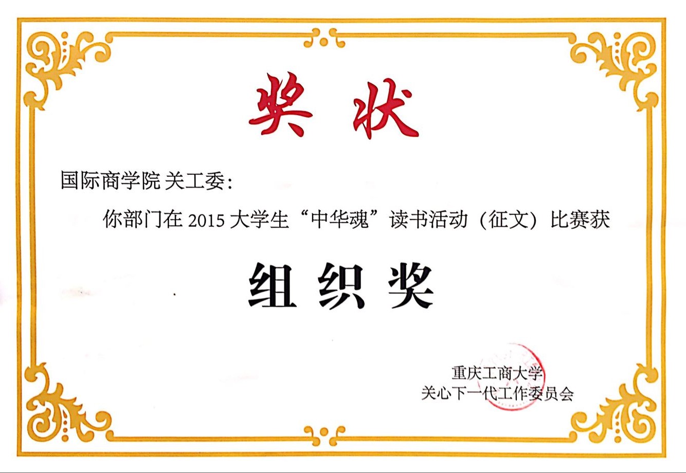 2015年,重庆市“中华魂”主题教育活动以“践行核心价值观凝聚中华正能量”为主题,学校开展了主题读书征文活动。必赢官网关工委高度重视此项工作,专门召开“中华魂”征文动员及布置会,会后各班级辅导员老师精心组织、耐心指导班级同学踊跃参与,共征集征文36篇。必赢官网关工委获得学校2015年大学生“中华魂”读书征文比赛组织奖;2013级法语系孙子棋同学获得重庆市教委“中华魂”读书征文比赛三等奖和校级二等奖(指导教师:田莎),2014级中法2+2崔瑶同学获得校级“中华魂”读书征文比赛三等奖(指导教师:熊敏)。