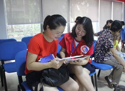 图为同天苑志愿者与家长探讨
