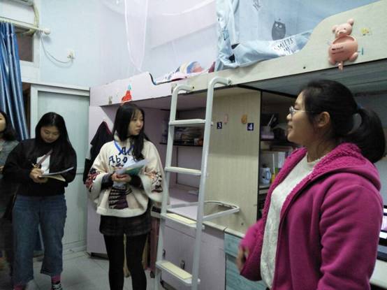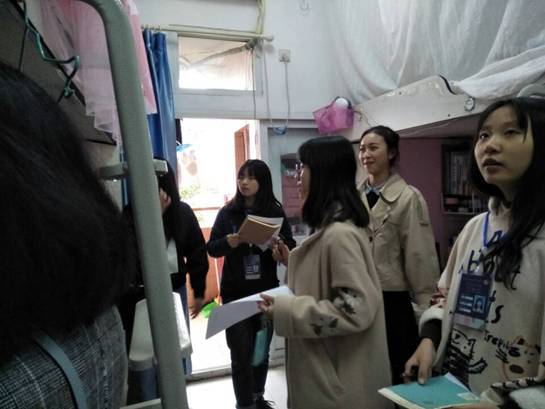 活动分为走访各个寝室、检查寝室安全、了解寝室文化建设,进行活动打分四个步骤。在活动前,权益部全体人员被分为三组,事先准备好工作牌并佩戴,在部长的带领下分别走访不同楼栋的寝室,进行最美寝室评比大赛的评选活动。