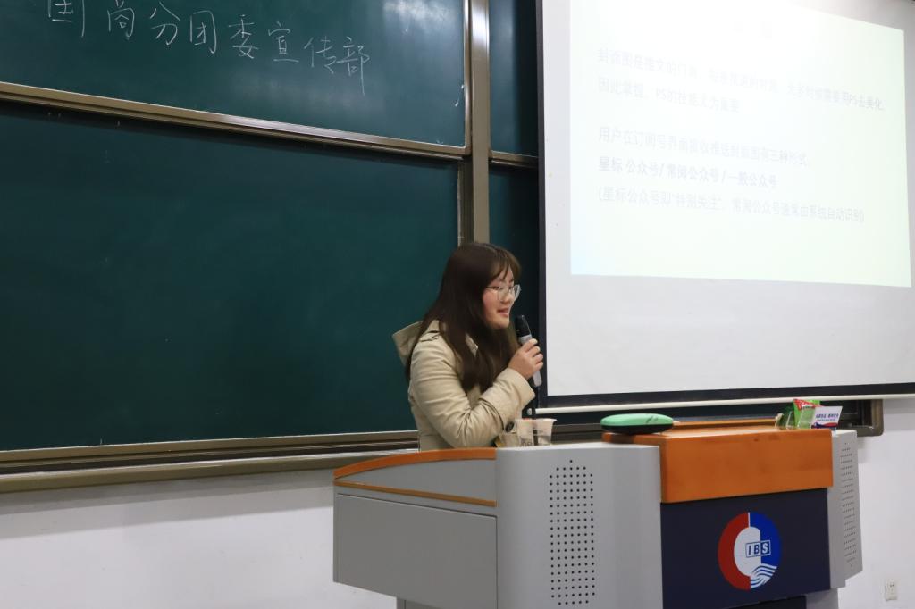 接下来轮到了部长张舒婷讲解微信推送的相关方法,张部长不仅解释了内外包装的构成,还区分了用户接收到的封面图的三种形式,使大家能够通过视觉上的鲜明对比而更加注重微信推送规范的重要性。活动最后,部长覃瑶以ps相关技术的教学科普作结,覃部长带领同学们了解了ps软件中众多符号的作用,并分享了一些自己学习ps期间使用过的技术网站,同时鼓励大家平时多动手,才能做到熟能生巧。