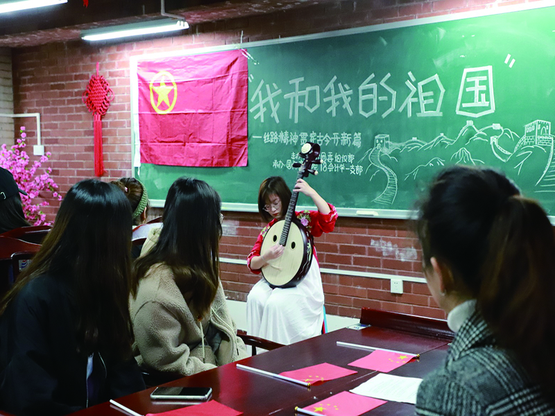 活动在以“丝绸之路”为背景的幻灯片播放中拉开序幕,全体起立合唱中国共产主义青年团团歌,活动正式开始。随后,悠扬的古阮曲——《丝路驼铃》拉开了“丝路”的篇章。通过汉代张骞通西域以及明朝郑和下西洋的故事,致敬贸易先驱。对原子弹实验场景还原,以小见大,再现建国70年来的艰苦奋斗历程。