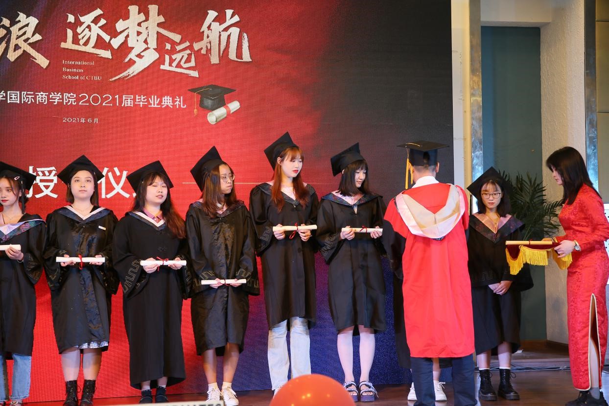 第六个环节也是本次典礼最激动人心的环节——学位授予仪式。随着悠扬的音乐,毕业生一组组依次上台领取学位证书。学院院长赵驹教授,为每一位同学授予学位证并拨穗,寓意着稻穗成熟,毕业生们已学有所成,可以展翅高飞了。活动结束后,同学们纷纷在学院拍照留念,希望用照片将自己的青葱年华定格,永远留在工商大。