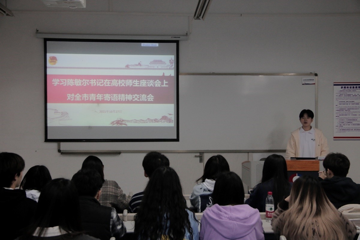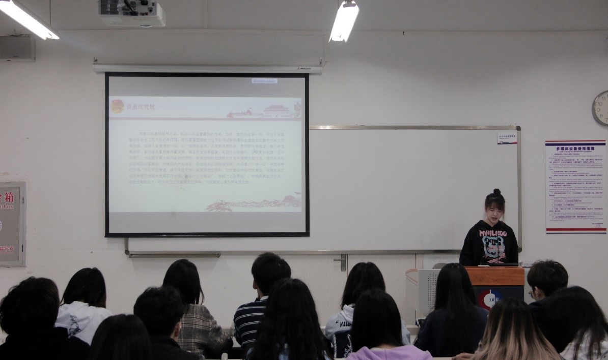 随后,学生会主席团成员金亦程同学介绍了学习交流会的第二部分,“说重庆生活”。陈书记在座谈会上表示,当前,重庆与全国一样,开启了全面建设社会主义现代化的新征程,紧紧围绕把习近平总书记殷殷嘱托全面落实在重庆大地上这条主线,坚持从全局谋划一域、以一域服务全局,立足新发展阶段、贯彻新发展理念、融入新发展格局,奋力谱写重庆高质量发展、高品质生活新篇章。金亦程同学总结道,我们作为在重庆学习生活的青年,应该关心关注重庆发展,思考自己能在重庆现代化建设进程中起到什么作用,贡献什么力量。