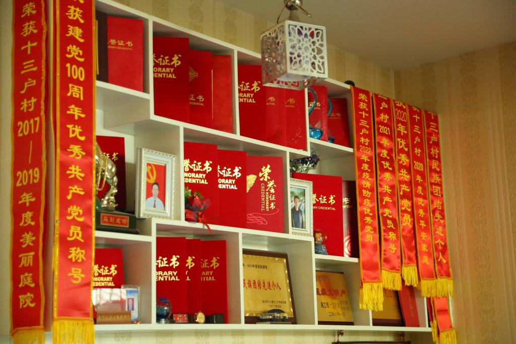 随后我们走访了一位已在村里生活了40多年村民,她见证了村里的发展变化,特别是这10年来,她和村民们从以前的老旧村庄整体搬进了环境优美的小康村。实践团成员与村民进行了亲切交谈,详细了解她的生活情况以及生活中存在的实际困难和需求。在她家中有一面“光荣墙”,上面摆满了她的丈夫作为一位老党员,在投身于祖国建设长征中获得的荣誉。她谈到,她的丈夫对党和人民的事业始终兢兢业业,用实际行动践行初心使命,与党风雨同舟、担当奉献的精神。在优良家风的引导下,她的女儿也成为了一名共产党员,继续在建设社会主义现代化强国之路上肩负新时代的使命与担当,赓续光荣传统,传承优良作风。