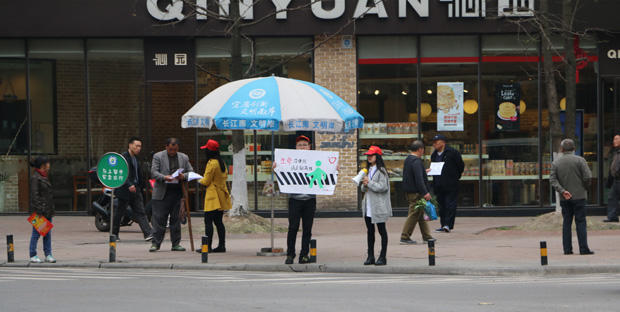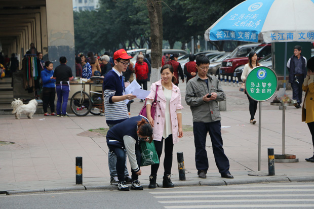 当日下午14点,所有参加活动的成员们在校门口集合,分配好小组任务后,分别到达四公里永辉超市、110中学门前、回龙湾溯源阁附近,并领取预先复印的600份宣传单、会旗、小红帽工作证等,活动随即正式开始了。
