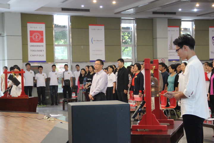 活动第一阶段为纪念孔子诞辰2566周年仪式,赵院长首先与所有与会者一起回顾了孔子生平,并对孔子及其弟子创立、发展、完善的儒家文化进行了高度评价。接着,全体与会人员肃立,奏响祭孔大典音乐,并由两位学生代表击钟、击磬,在庄严肃穆的音乐过后,所有与会者向多功能厅内的孔子行教像三鞠躬,祭孔仪式礼成。