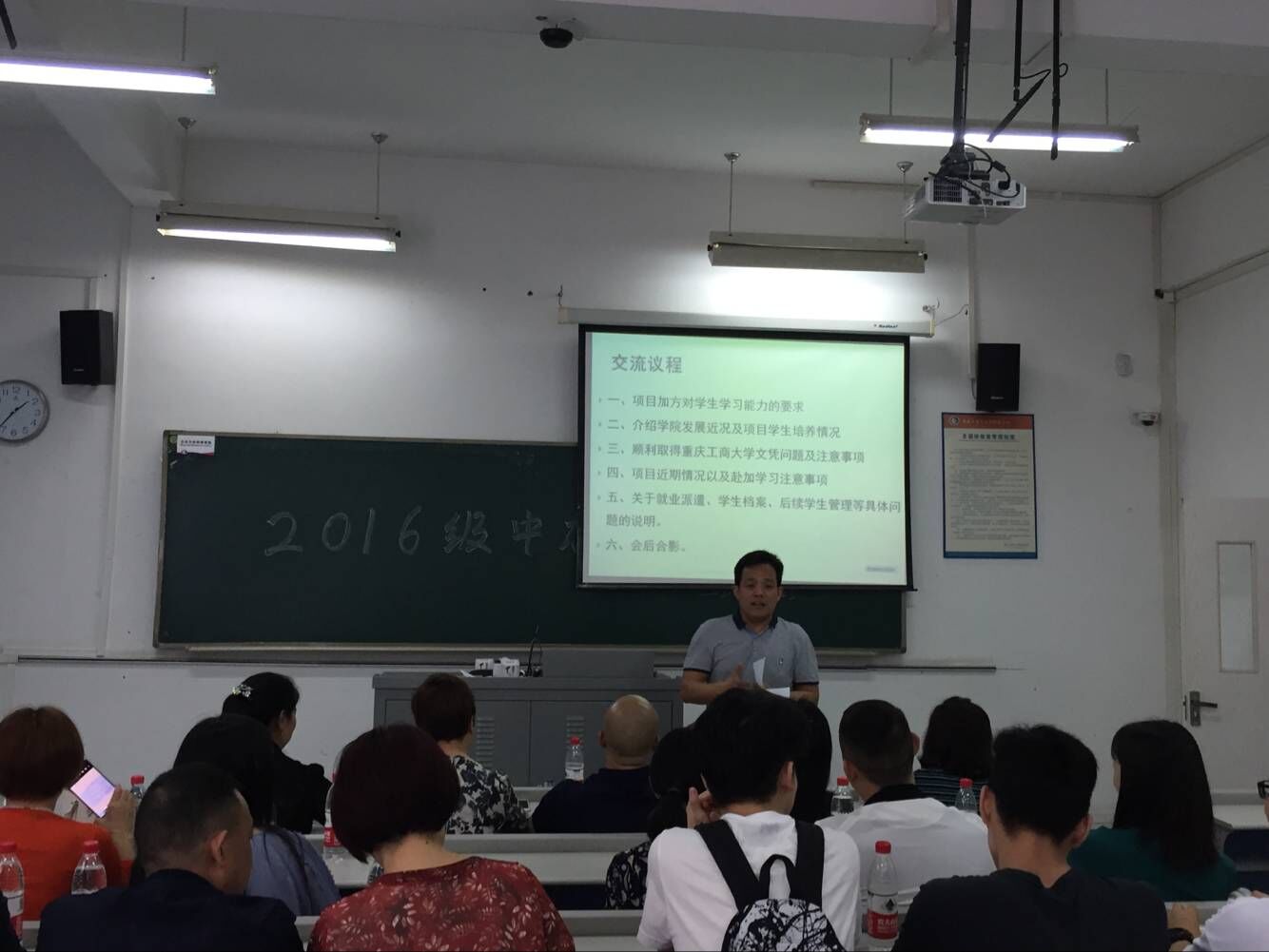 2018年5月25日,2016级中加项目家长会在必赢76net线路唯一官方网站60400教室举行,会议由国交部部长李玺主持,副院长李大鹏,院长助理庞卫真,教学部部长苟焰,学生部部长黎红,专业教研室陈昌盛副教授,2+2后续管理熊敏老师等出席了会议。