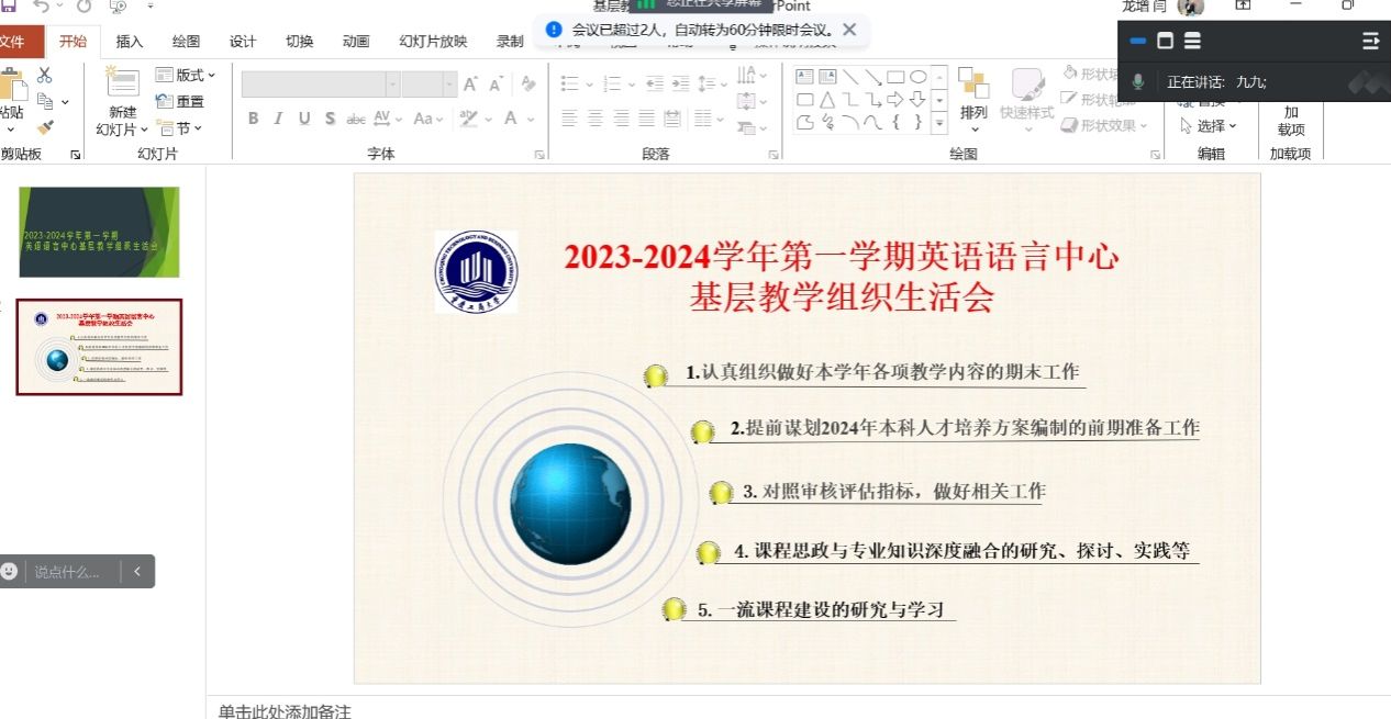 2023年1月8日,必赢76net线路唯一官方网站英语语言中心召开了2024年第一次教学组织生活会,会议围绕“新一轮教育部审核评估”“项目班雅思考试情况”和“2024年工作展望”三项议题开展。