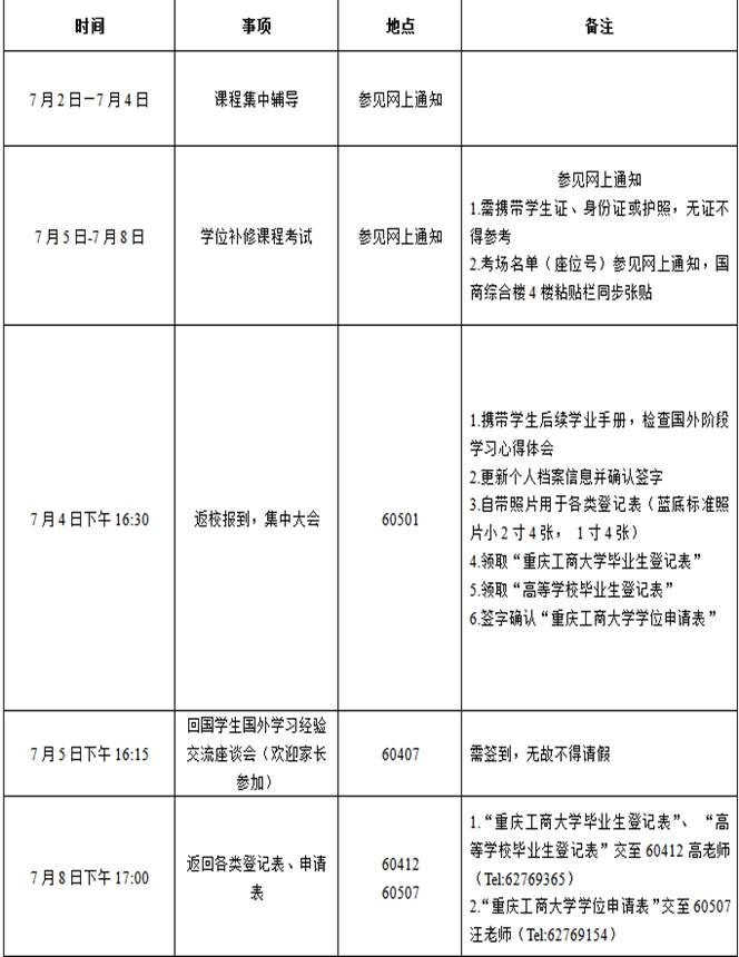 关于2016年7月回国取位考试返校报到相关事项安排的通知