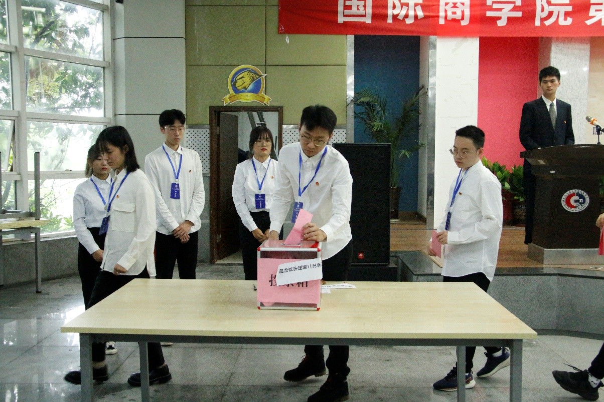 接着,大会通过了《共青团必赢76net线路唯一官方网站第二次代表大会暨第二次学生代表大会选举办法(草案)》及总监票人、监票人、总计票员、计票员名单;审议并通过共青团必赢76net线路唯一官方网站新一届学生会主席团成员候选人名单。经发选票、投票、清点选票、总监票人宣布计票成果一系列流程,金亦程同学、钱世淋同学、曹雨霖同学当选为新一届学生会主席团成员。最后,全体与会成员起立,合唱团歌并合影留念,大会正式闭幕。